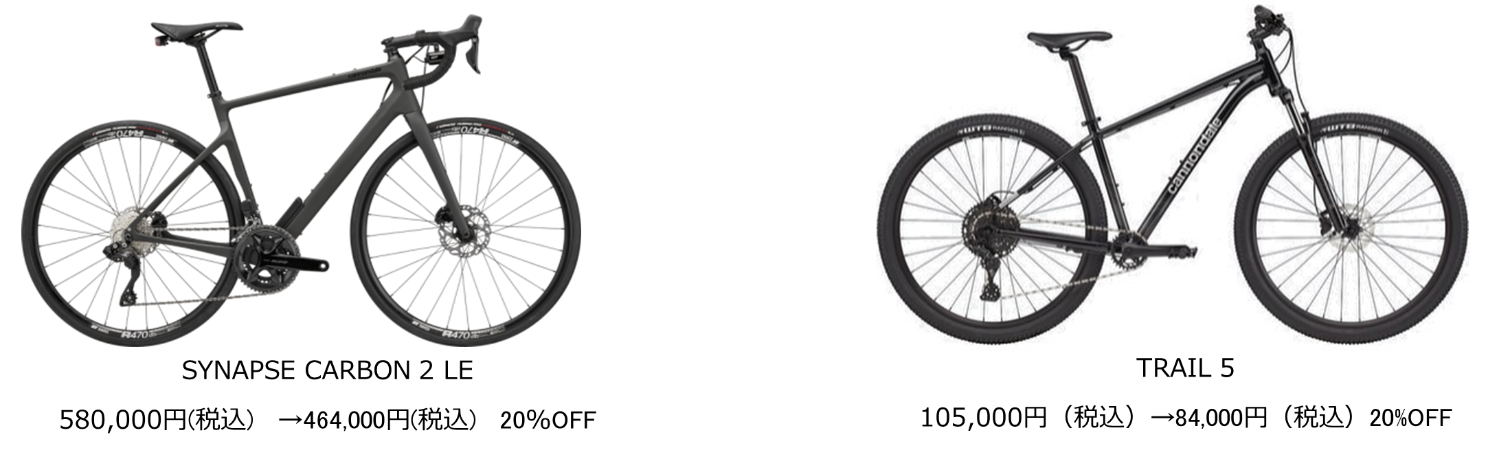 「ゴールデンウィークセール」&「CANNONDALEアーリーサマーセール」を開催!~春夏用ウェアが最大60%OFF、人気のバイクもお買い得~ カテゴリ: ニュース タグ: #PressRelease #ゴールデンウィーク #セール #SALE #CANNONDALE 株式会社ワイ・インターナショナルは、春夏用のウェアや完成車、ホイールなどがお得に買える「ゴールデンウィークセール」をスポーツ自転車専門店のワイズロード・オンラインで4月28日(金)20:00から5月8日(月)10:00まで、全国に展開する店舗では4月29日(土・祝)から5月7日(日)の期間に実施いたします。また、人気バイクブランド「キャノンデール」の対象車種が30%割引になる「CANNONDALEアーリーサマーセール」は6月30日(金)まで開催中です。 今回の「ゴールデンウィークセール」では、今すぐ使える春夏のウェア3,000点以上が最大60%OFFで購入いただけます。さらに、FULCRUMのホイールが50%OFF、人気8大ブランドのクロスバイクがお買い得価格になります。この機会に是非お買い求めください。 【ゴールデンウィークセール概要】 名称:ゴールデンウィークセール 実施期間: オンライン:2023年4月28日(金)20:00~5月8日(月)10:00 店舗:2023年4月29日(土・祝)~5月7日(日) 対象商品(一部): ウェア:約3,000点(最大60%OFF) 完成車:人気8大ブランドの対象クロスバイク ホイール:FULCRUM ロードディスクホイール RACING ZERO COMPETIZONE DB カスタム レッドスポーク 2WAY-FIT シマノフリー(50%OFF) URL:https://online.ysroad.co.jp/shop/l/l-weekendsale-00/ 「CANNONDALEアーリーサマーセール」は、CANNONDALEの対象車体が最大30%OFFとなる期間限定のセールです。ロードバイクからグラベルロード、マウンテンバイク、キッズバイクまで、幅広い車種がセールの対象となっていますので、この機会に是非お買い求めください! ※最大30%OFFの対象品「Adventure 2」はお取り寄せ対応となります。 【CANNONDALE アーリーサマーセール概要】 名称:CANNONDALE アーリーサマーセール 実施期間:6月30日(金)まで開催中 対象車体(一部): SYNAPSE CARBON 2 LE〔580,000円→464,000円〕20%OFF TRAIL 5〔105,000円→84,000円〕20%OFF Kids Trail FW 20〔48,400円→38,720円〕20%OFF Bad Boy 2〔155,000円→124,000円〕20%OFF ※価格はすべて税込み URL:https://online.ysroad.co.jp/shop/l/l00?keyword=CANNONDALEEARLYSUMMERSALE&image=